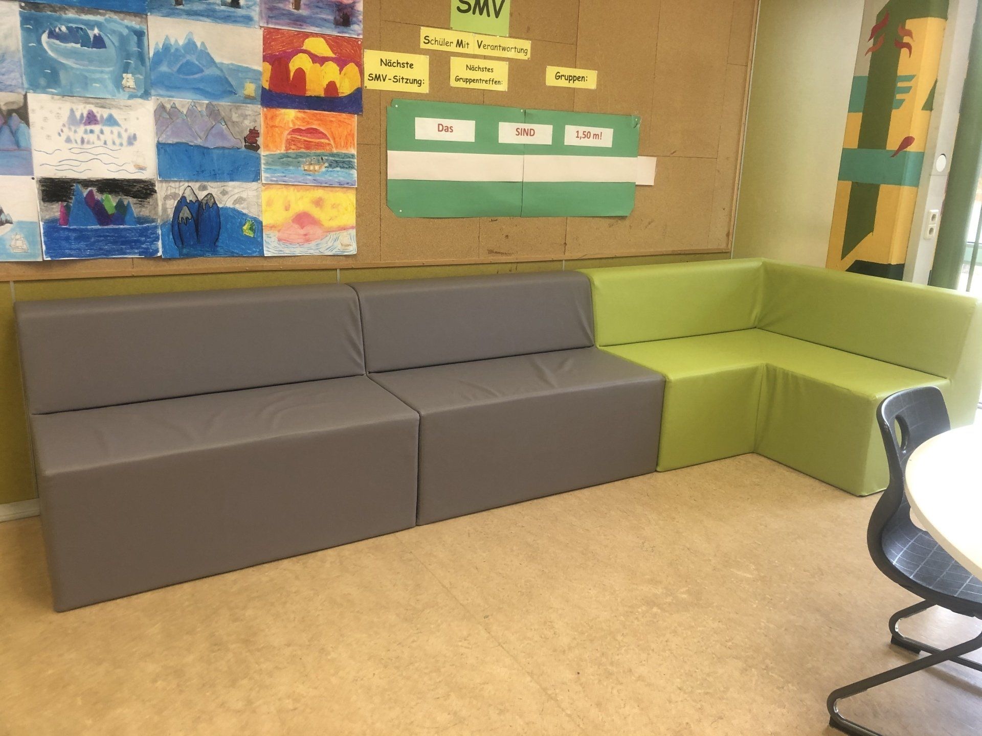 Mithilfe dieser finanziellen Zuwendung konnte letzte Woche ein langjähriger Wunsch der Schülerschaft in Erfüllung gehen: ein gemütliches und farbenfrohes Sofa wurde in der Aula der Realschule aufgestellt! Es ist so groß, dass es sogar in Pandemiezeiten